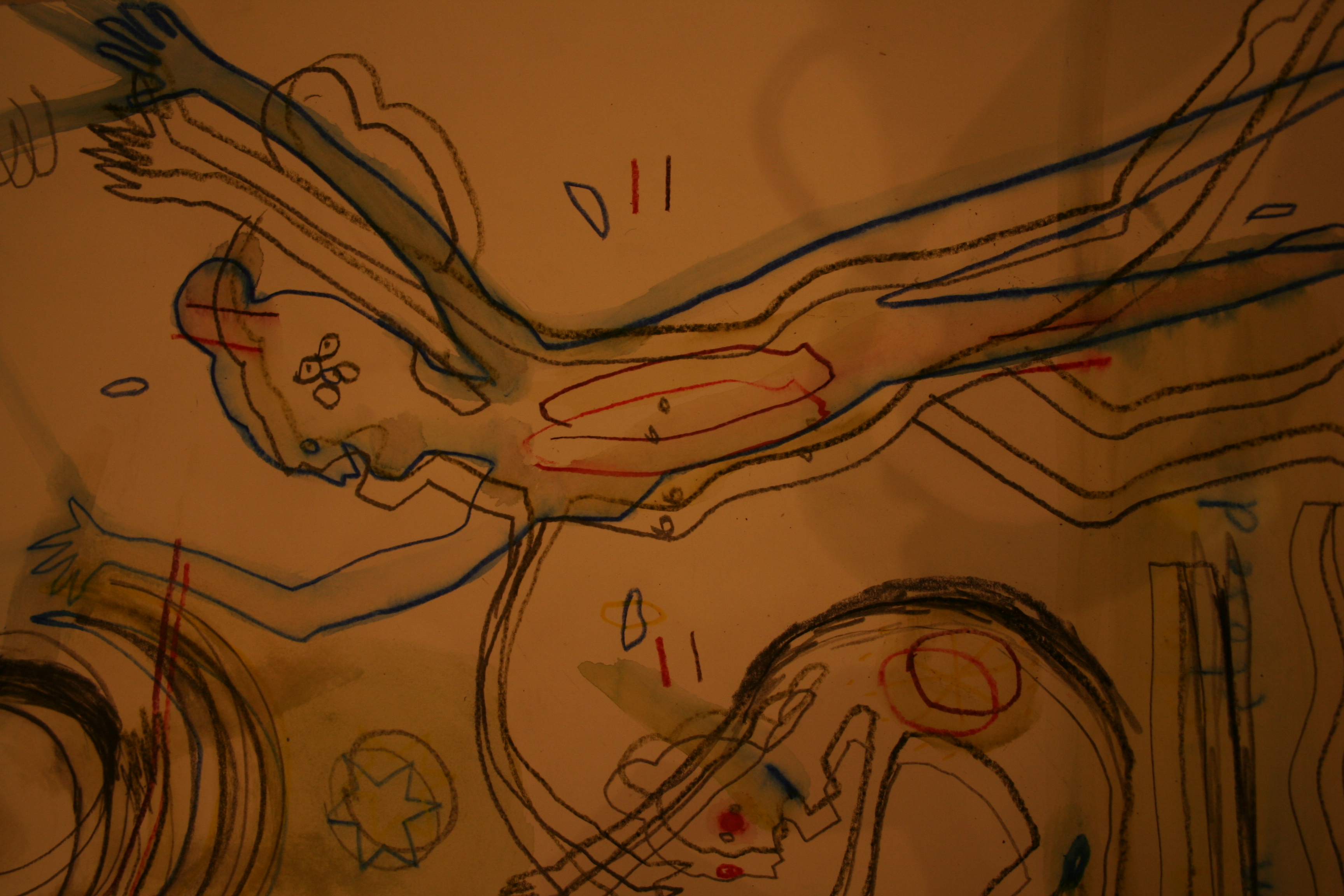 Layers of Drawing, constructing and photographically recording. Emphasis on observing these stages in areas of intense light and darkness. The shining OHP angel and the mystical monster cupboard. Perspectives, views, angles, shining white light, dark deep shadows. Projected movement via a dancing source light. Movement via our dancing minds, triple jumping eyes and wowing mouths.