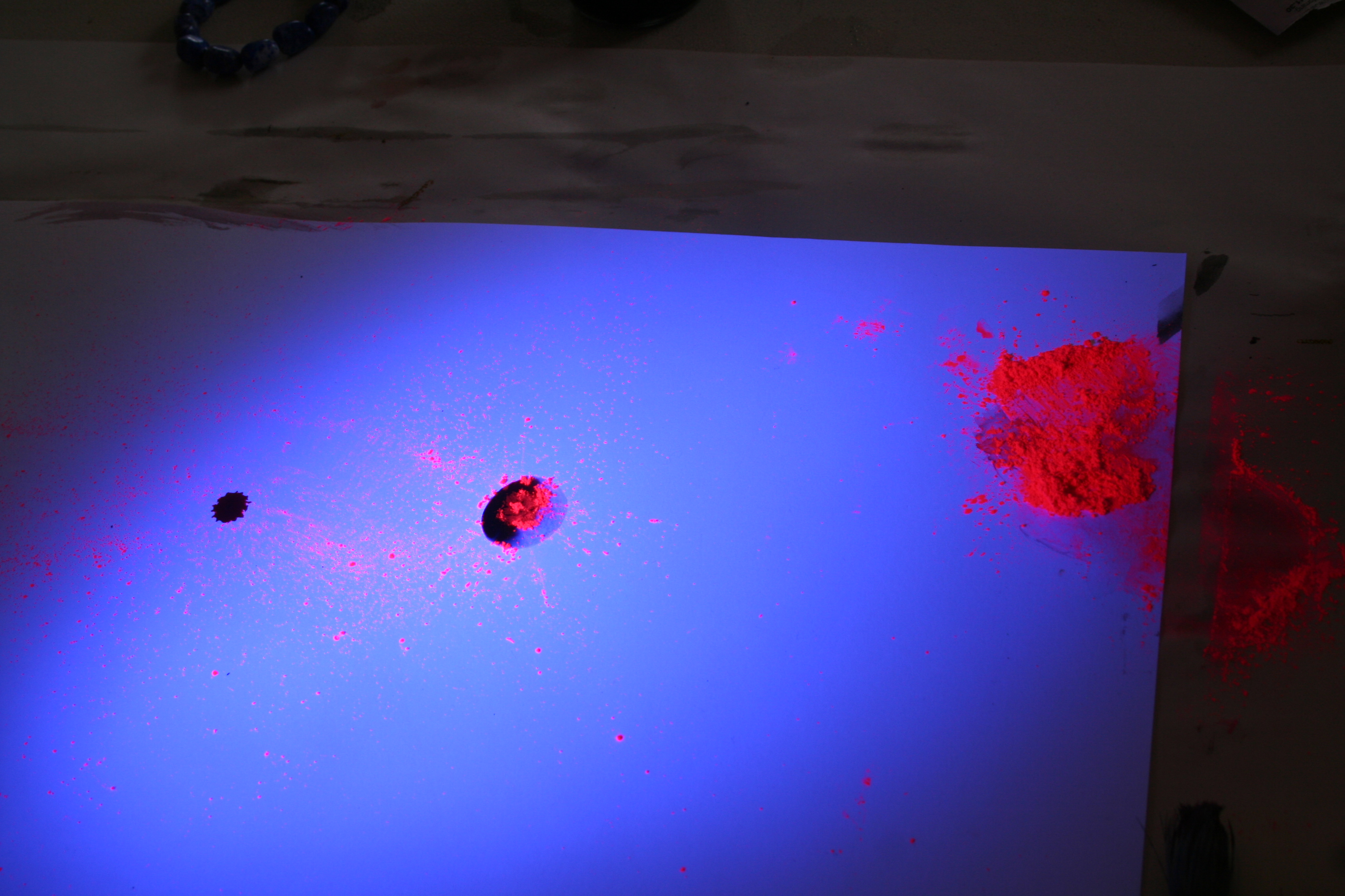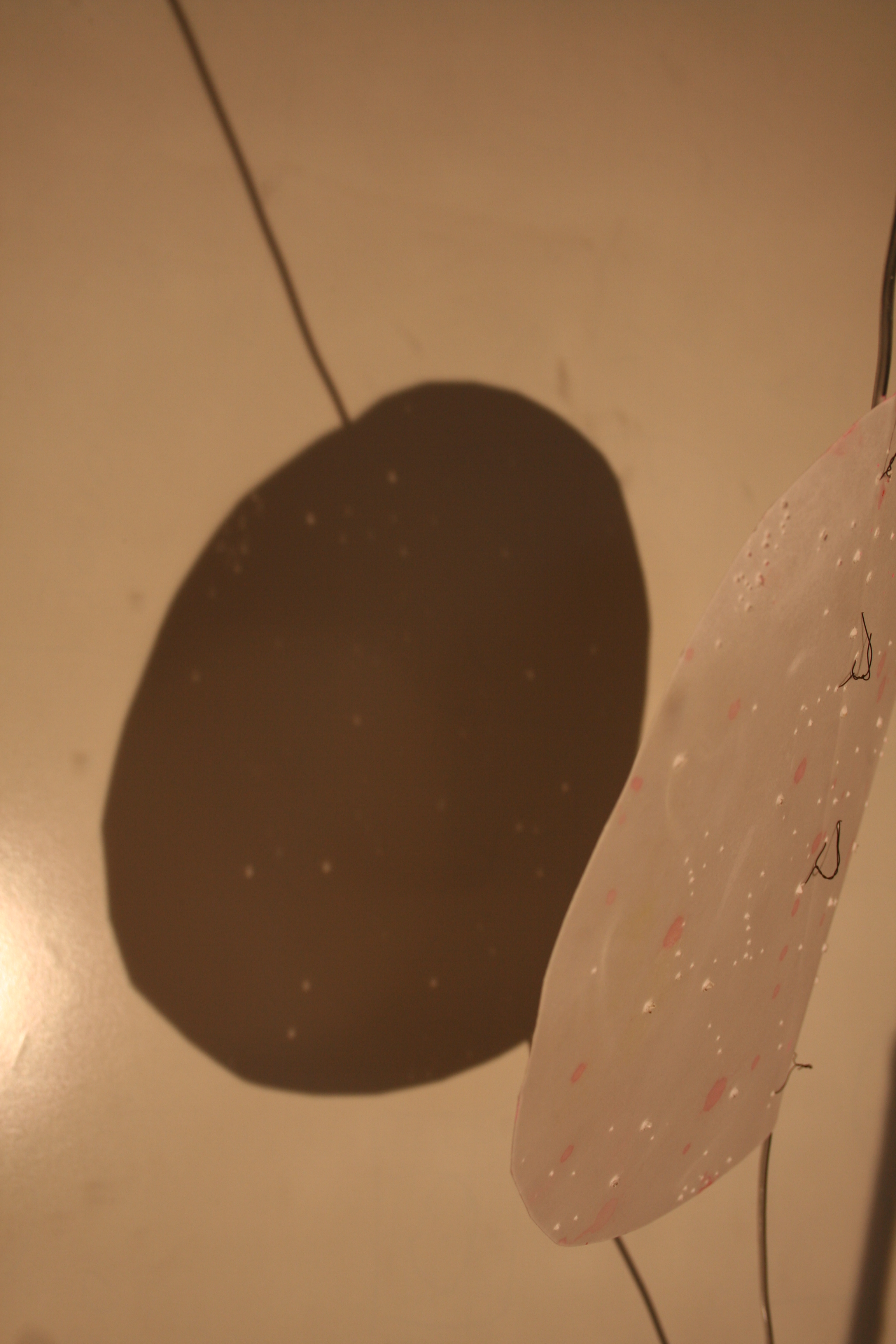 Different materials combined to create objects viewed in spaces of bright light and deep darkness. Elements of the whole= tonally exactly the same and also subtly different depending on the light source and strength and THE DISTANCE THE OBJECT IS FROM THE PLACE WHERE THE SHADOW FALLS. Translucency, opacity do not have a bearing on how the shadow looks BUT when placed close to the surface COLOUR adds a reflected dimension. Pink plastic + white wall + light behind= pink glow on the wall infront.