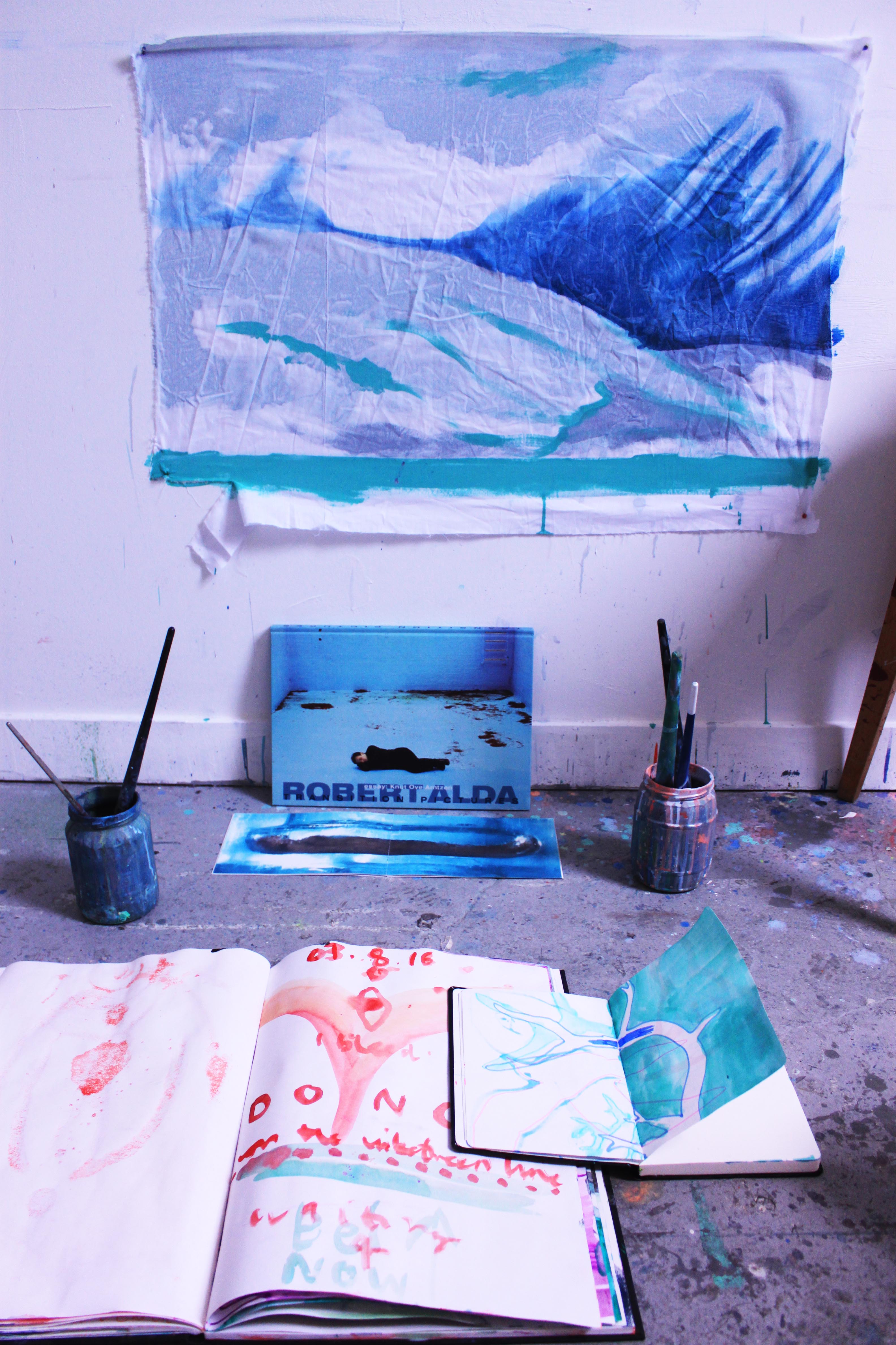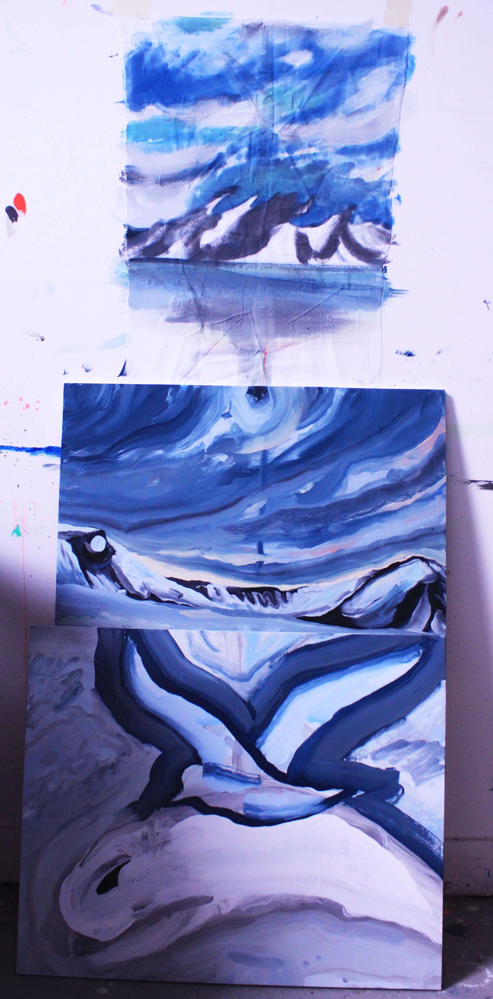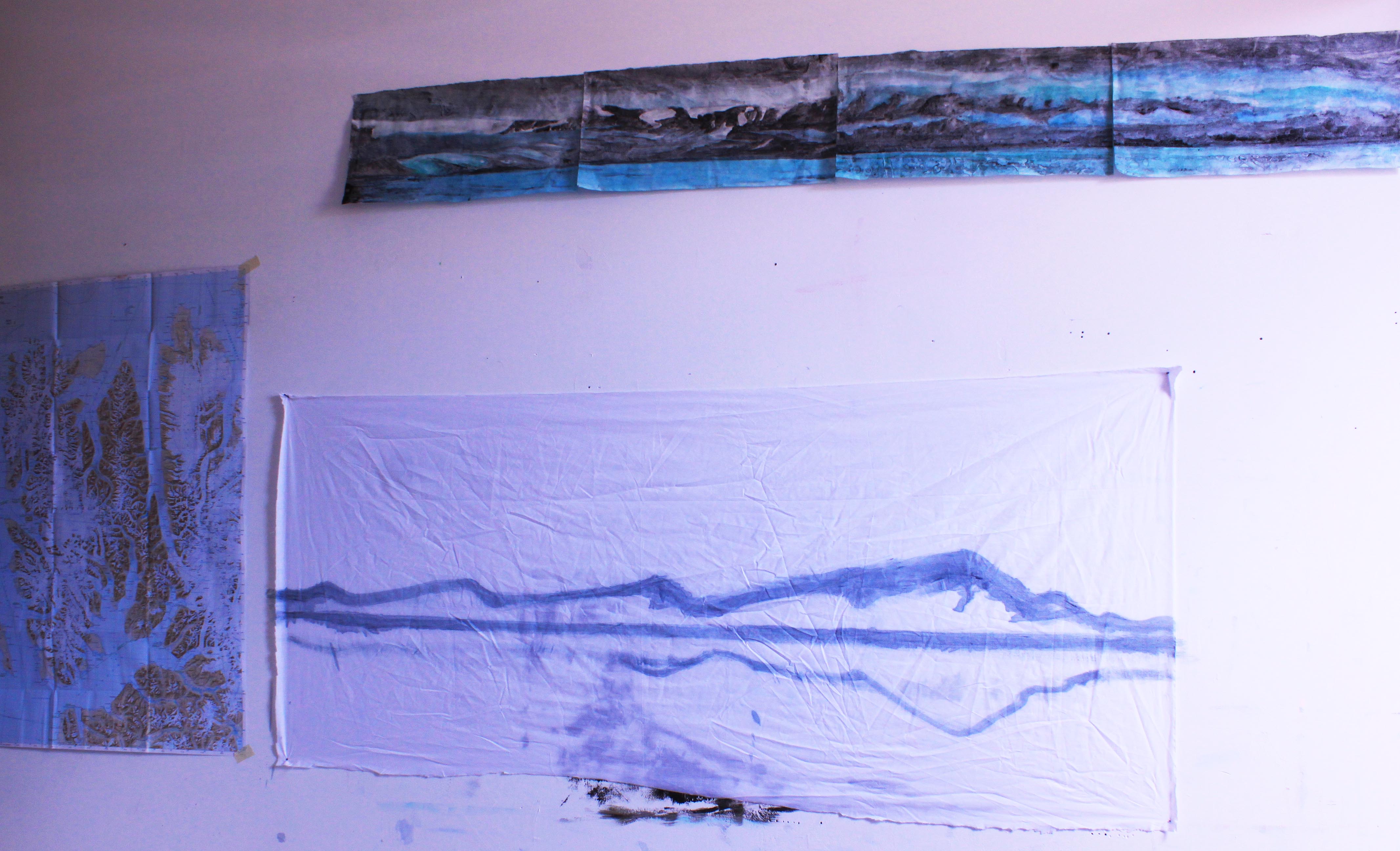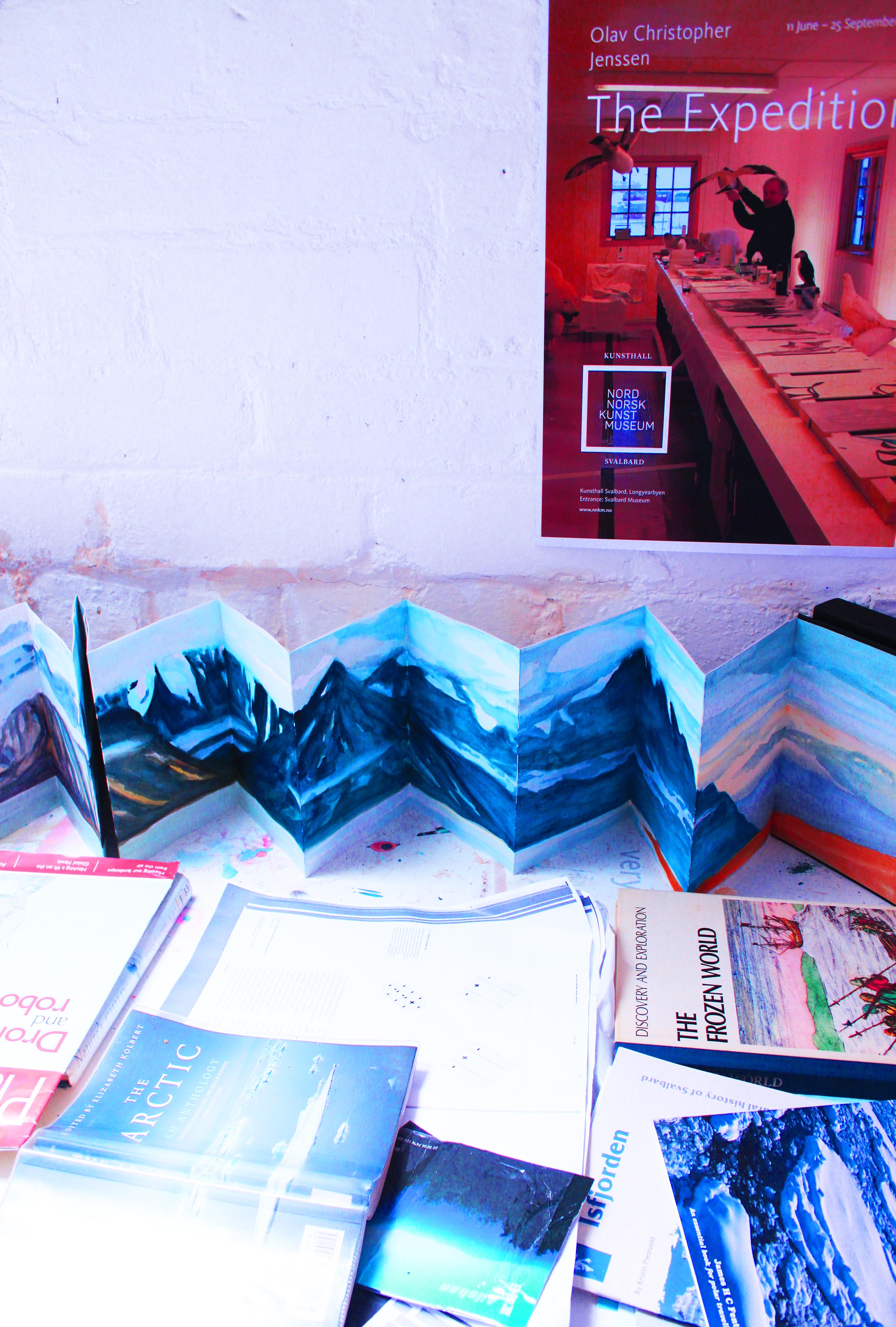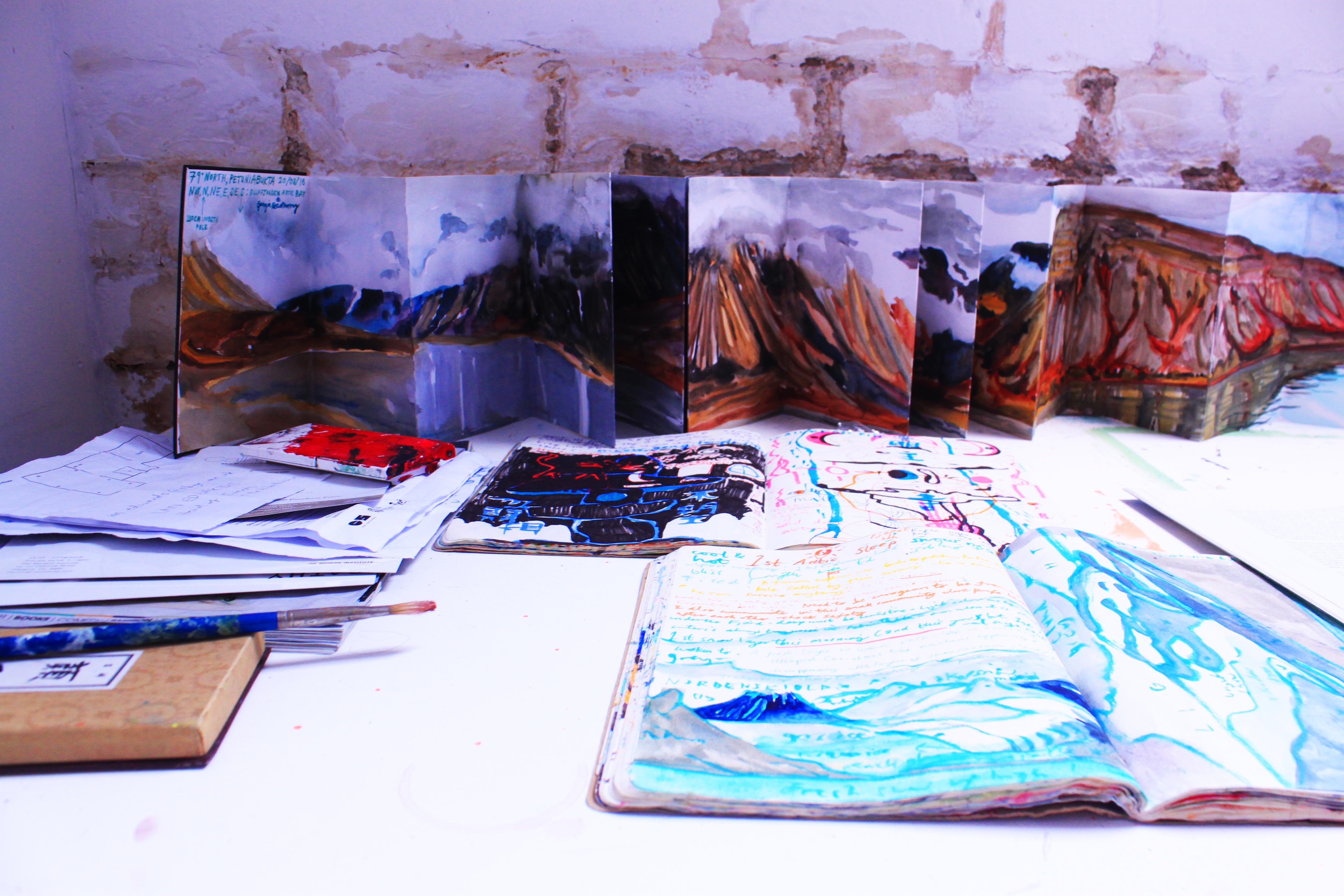 22 days since I departed from Longyearbyen and flew south to Scotland; to late summer warmth, to early dusky evenings, to friends, to exist again in a city realm. Hurled down from the sky in to a landscape hectic with vehicles, people, fumes, overwhelming options, beautifully starry and depressingly dark night-time skies and a wonderful studio which I stripped bare and painted white- a blank canvas ready to support expressions of my Arctic experiences. It’s felt hard and sad to be separate from the incredible Arctic space, the thrilling landscape and the majestic 24 hour sunlight. Every day those Northern surroundings provided natural nourishment which over time now feels to be leaking out of me. Every day I long to return to that simple existence which provided the sacred space for me to operate as a landscape painter; mixing water-colour and homemade ‘78 degree ash paint’, drawing in sketchbooks, exploring in all directions, all hours of the day, eating when hungry and sleeping when tired. Being an artist in Scotland now presents a busy situation in which I am also a friend, daughter, sister, girlfriend, Wasps studio companion, Painting Lecturer; lots of time consuming relationships which uplift, inspire and drain all at the same time. The Arctic period presented a special kind of focused living, as did the time when I spent the Icelandic winter making research for one month in 2015. I will create residency opportunities whenever possible.