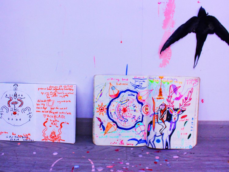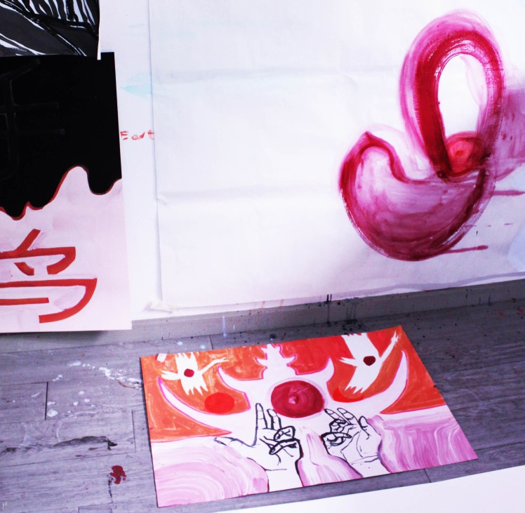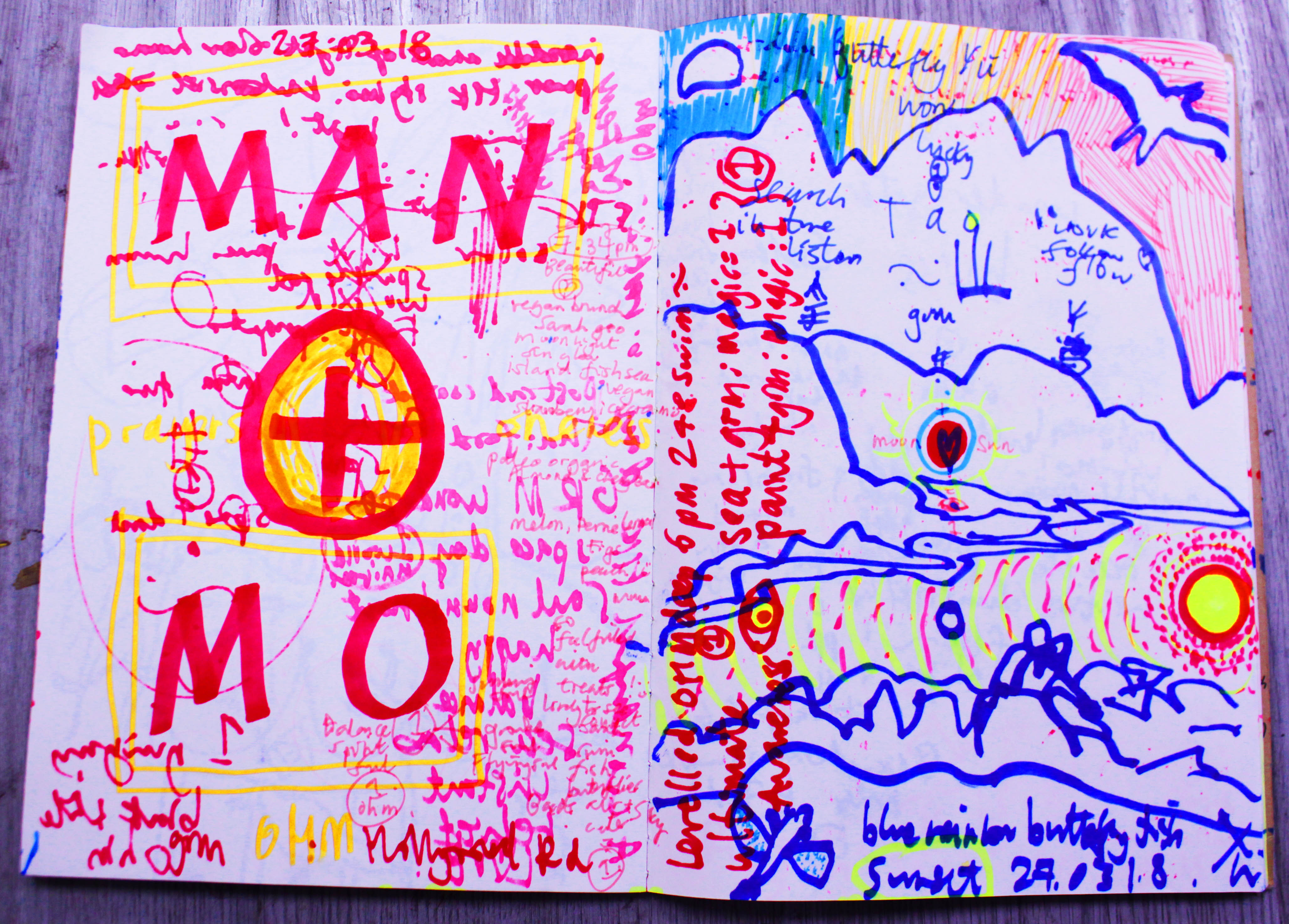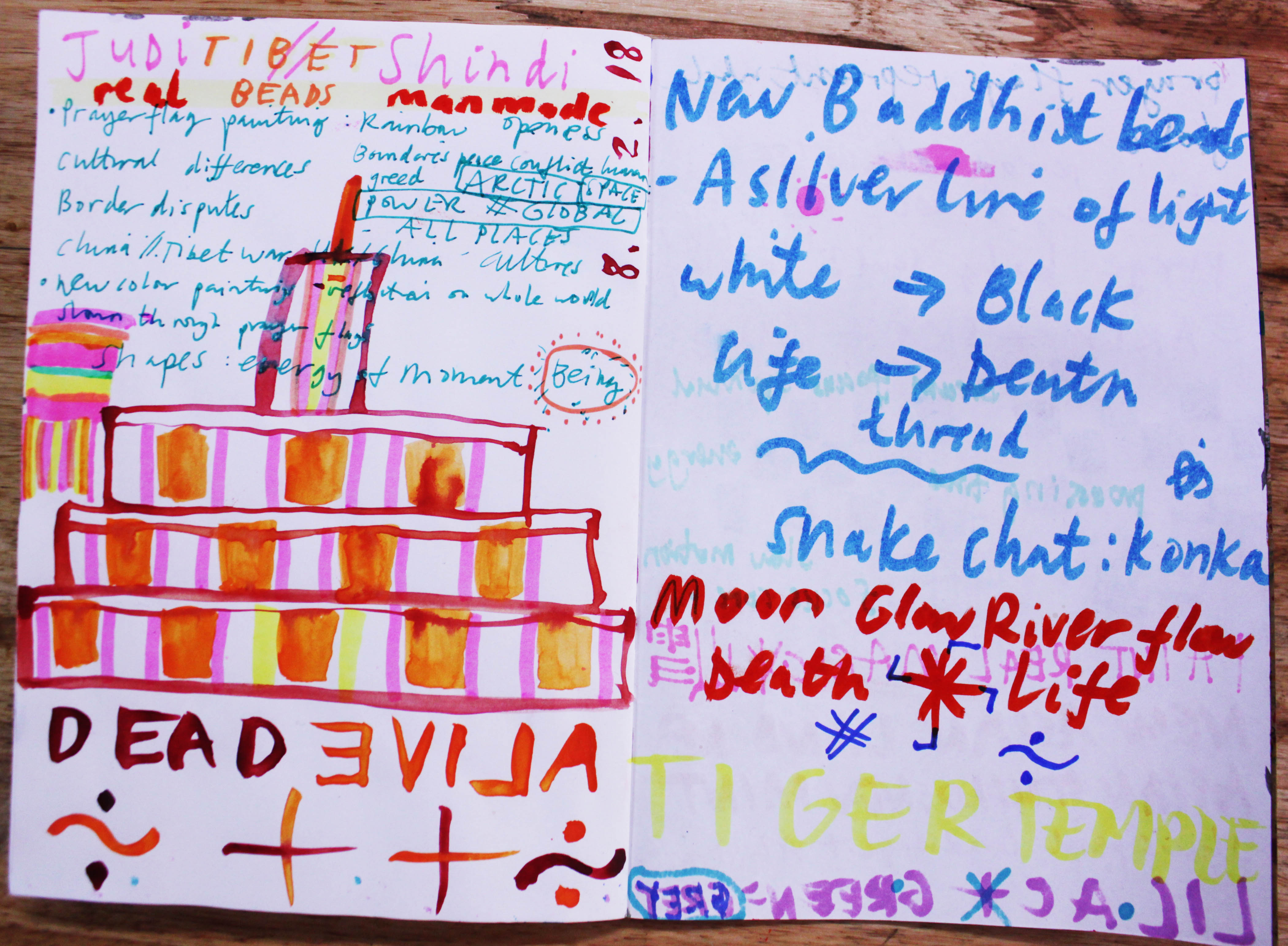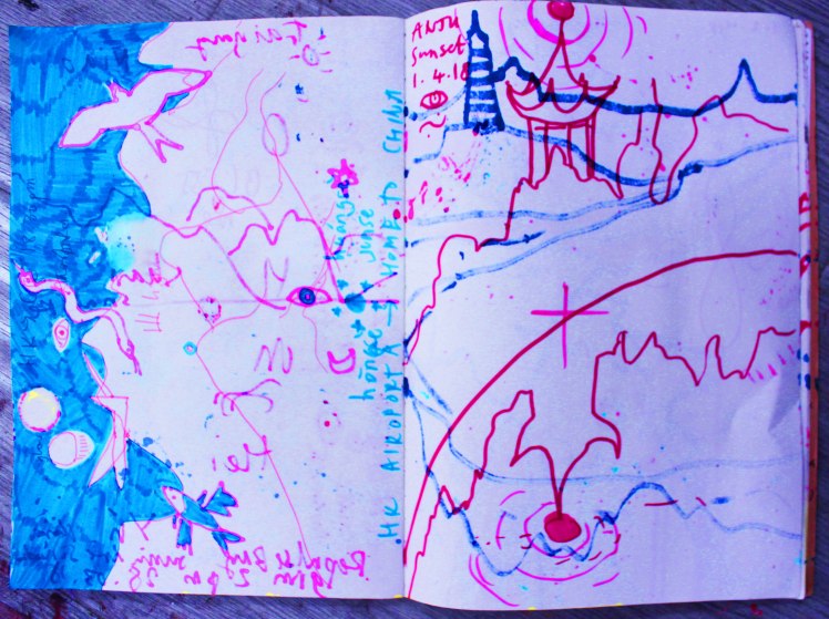 CQ, in land, Tibet. Beyond earth peaks, Hong Kong islands, sea, two step fluoro green snake, iridescent blue butterfly lion fish, hot orb, sun, bright bai moon, glowing sky, water golden, pink air, flowing bliss