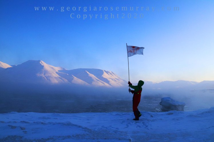 Painted Muslin Flag, Bamboo Pole, Sea Ice, Crystal Air, Mist, Human, Shadow, Arctic Sunrise.