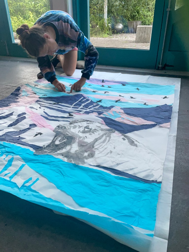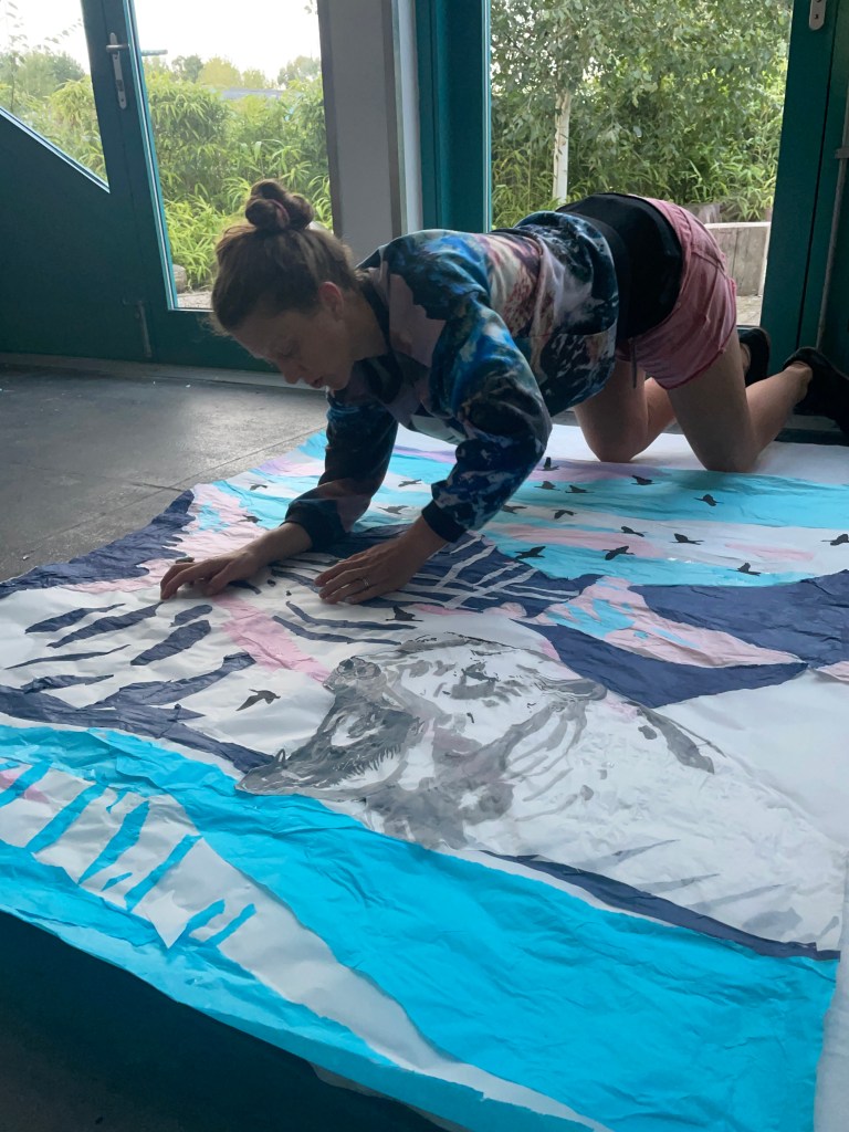 Thank you to Findhorn Bay Arts, who commissioned me to create a window design for their 2024 festival exhibition on Forres high street. The window was created by tearing an Arctic landscape out of coloured tissue paper and sticking the mountain, fjord and sky pieces to a window sized piece of tracing paper, using glue. The flock of geese was carefully cut out of black tissue paper using nail scissors and the Polar Bear was painted using black Indian Ink. The landscape is a depiction of the environment outside the Jean Corbel Research Station, near Ny Alesund, the northernmost research base on Earth and the closest settlement to the North Pole. The exhibition provided a lovely opportunity to bring a piece of Svalbard down to the town of Forres, and see that extremely northern location illuminated in the Murray Travel agents window.