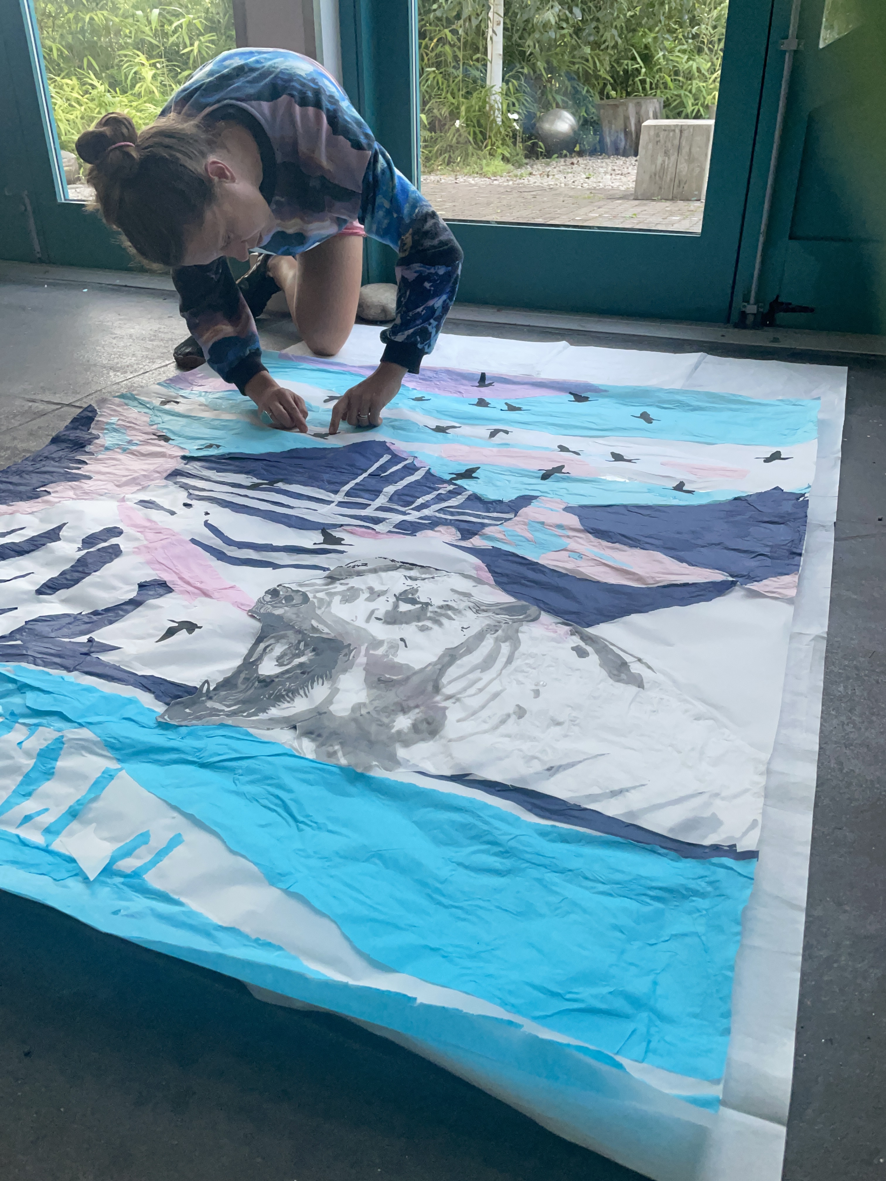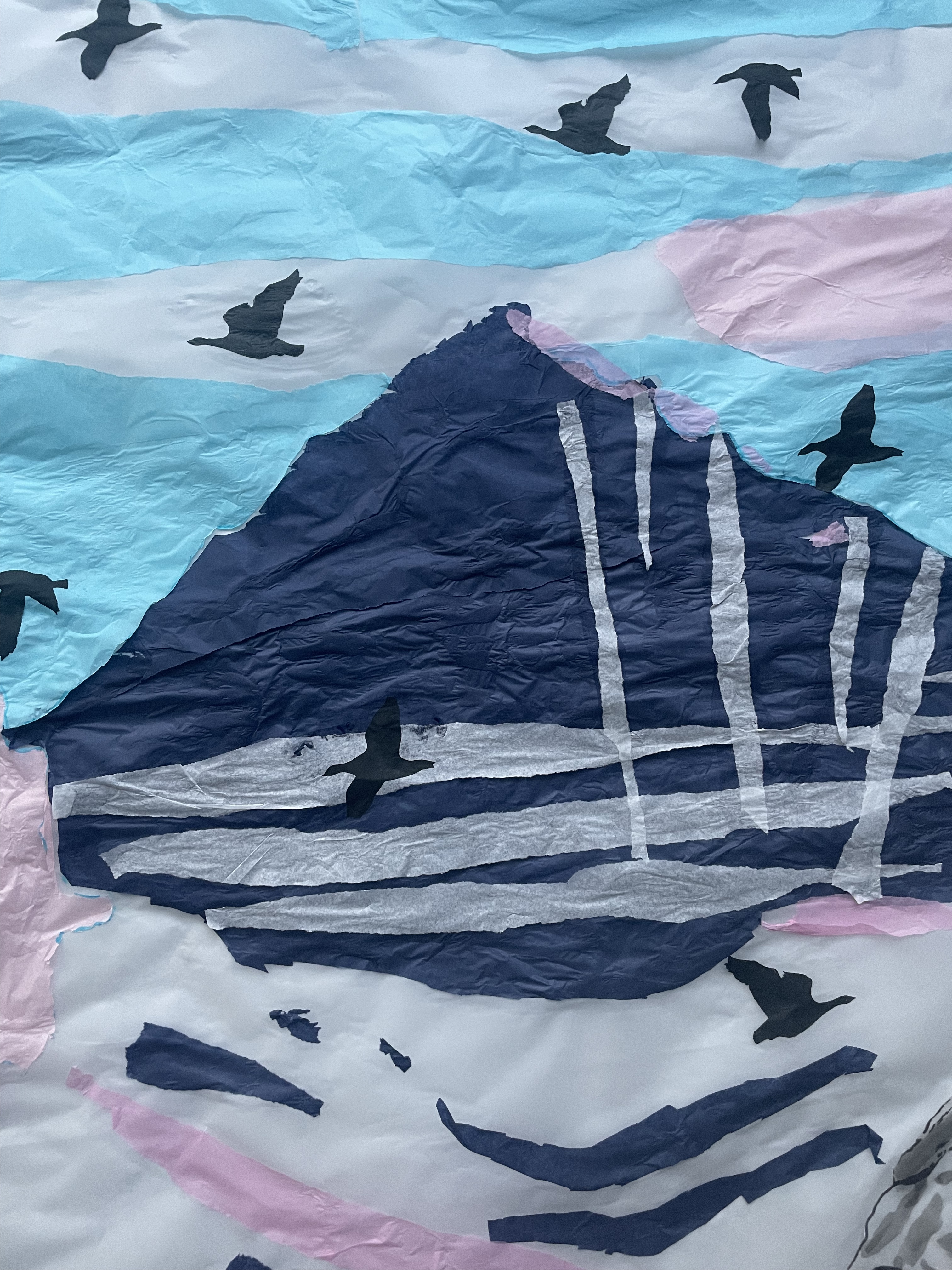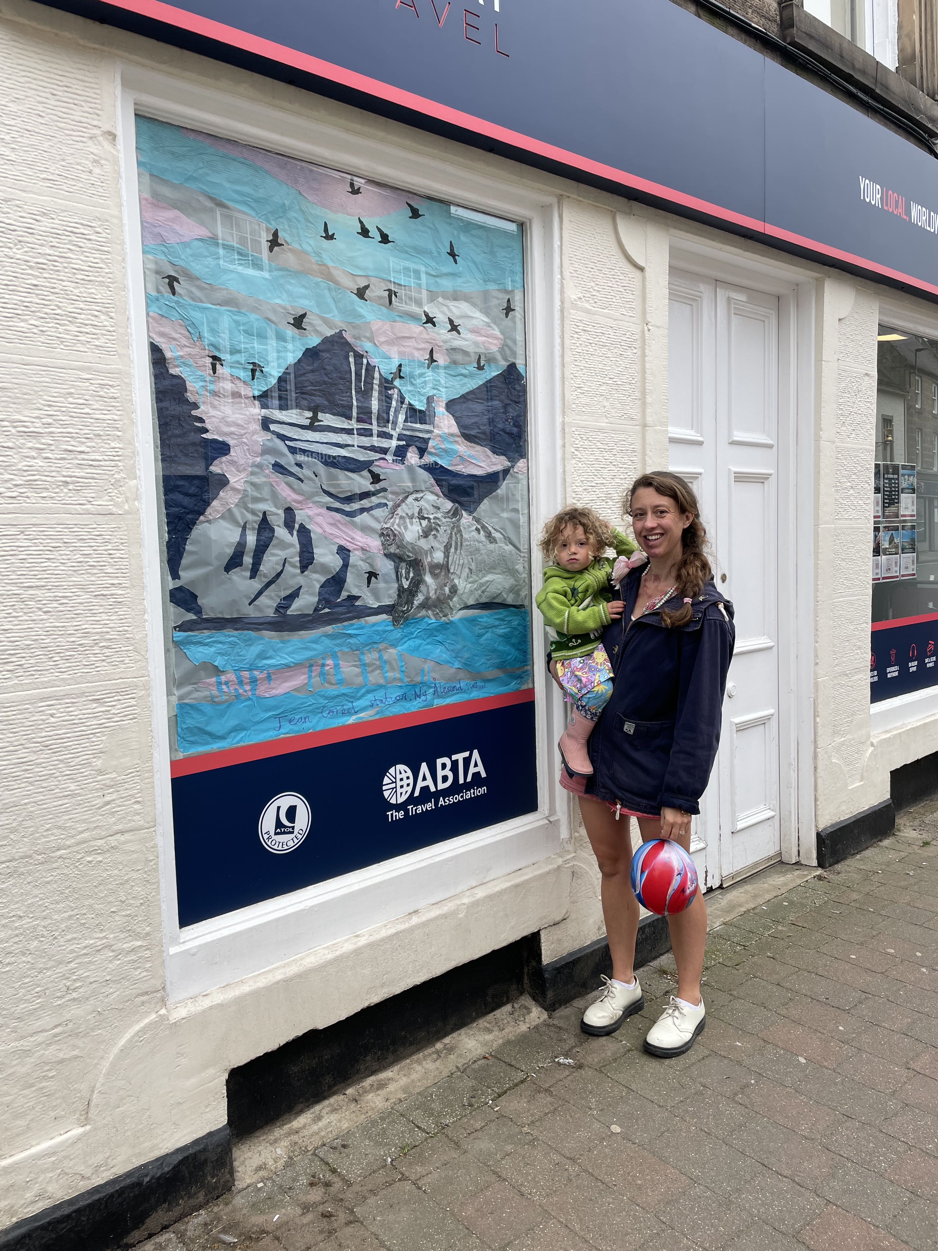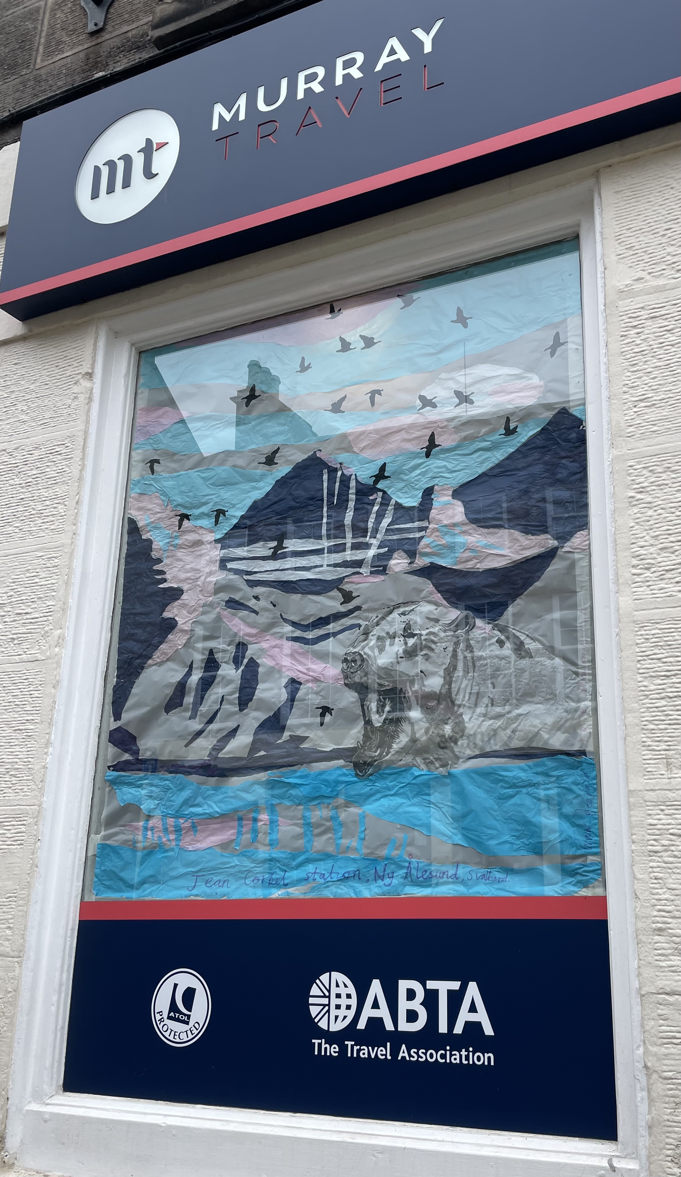 Thank you to Findhorn Bay Arts, who commissioned me to create a window design for their 2024 festival exhibition on Forres high street. The window was created by tearing an Arctic landscape out of coloured tissue paper and sticking the mountain, fjord and sky pieces to a window sized piece of tracing paper, using glue. The flock of geese was carefully cut out of black tissue paper using nail scissors and the Polar Bear was painted using black Indian Ink. The landscape is a depiction of the environment outside the Jean Corbel Research Station, near Ny Alesund, the northernmost research base on Earth and the closest settlement to the North Pole. The exhibition provided a lovely opportunity to bring a piece of Svalbard down to the town of Forres, and see that extremely northern location illuminated in the Murray Travel agents window.