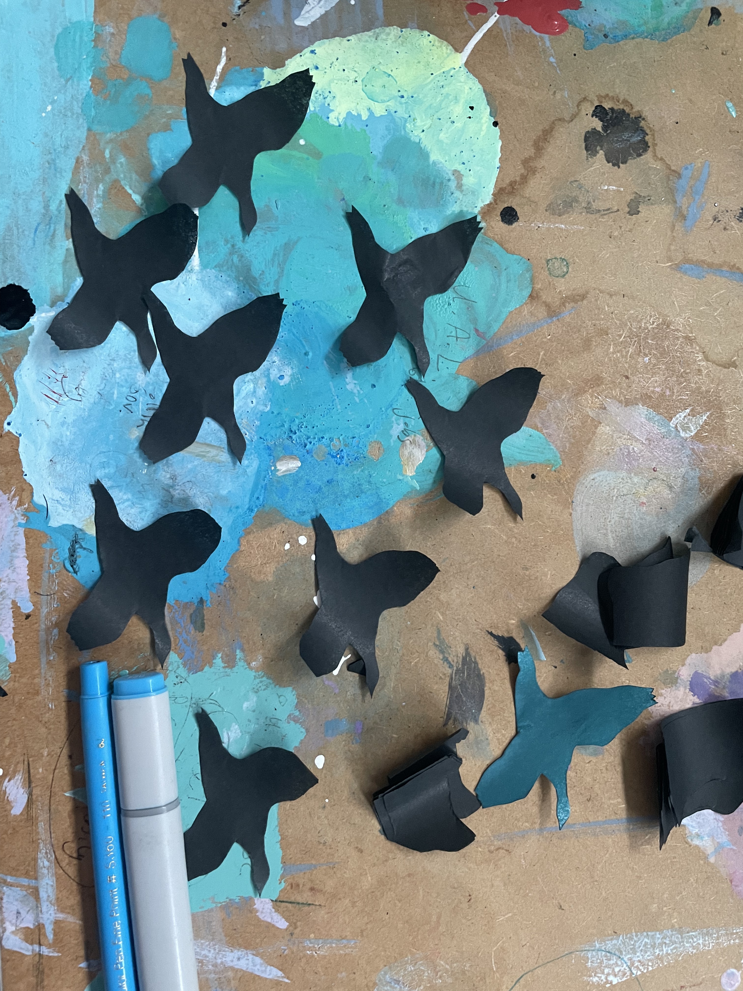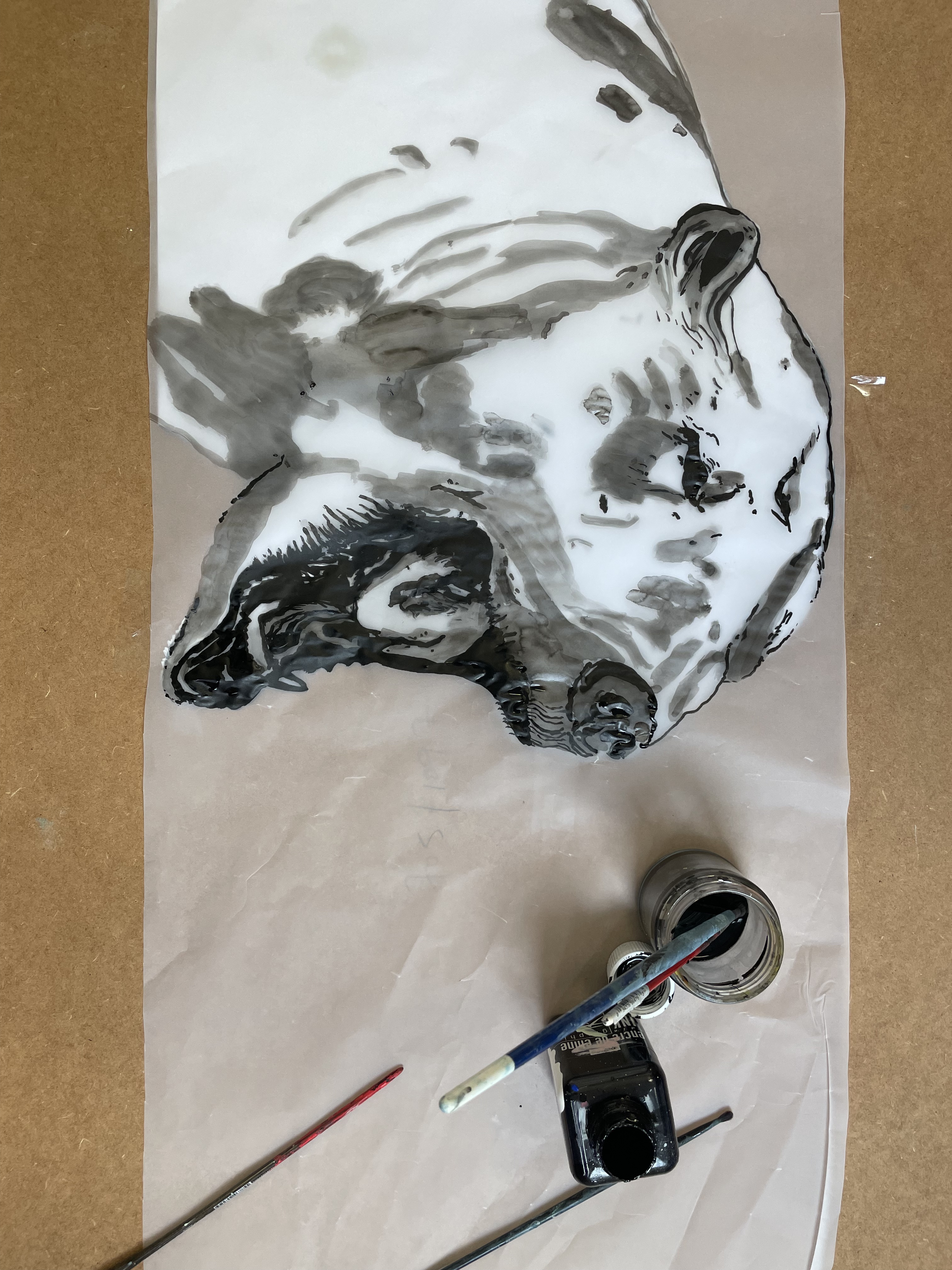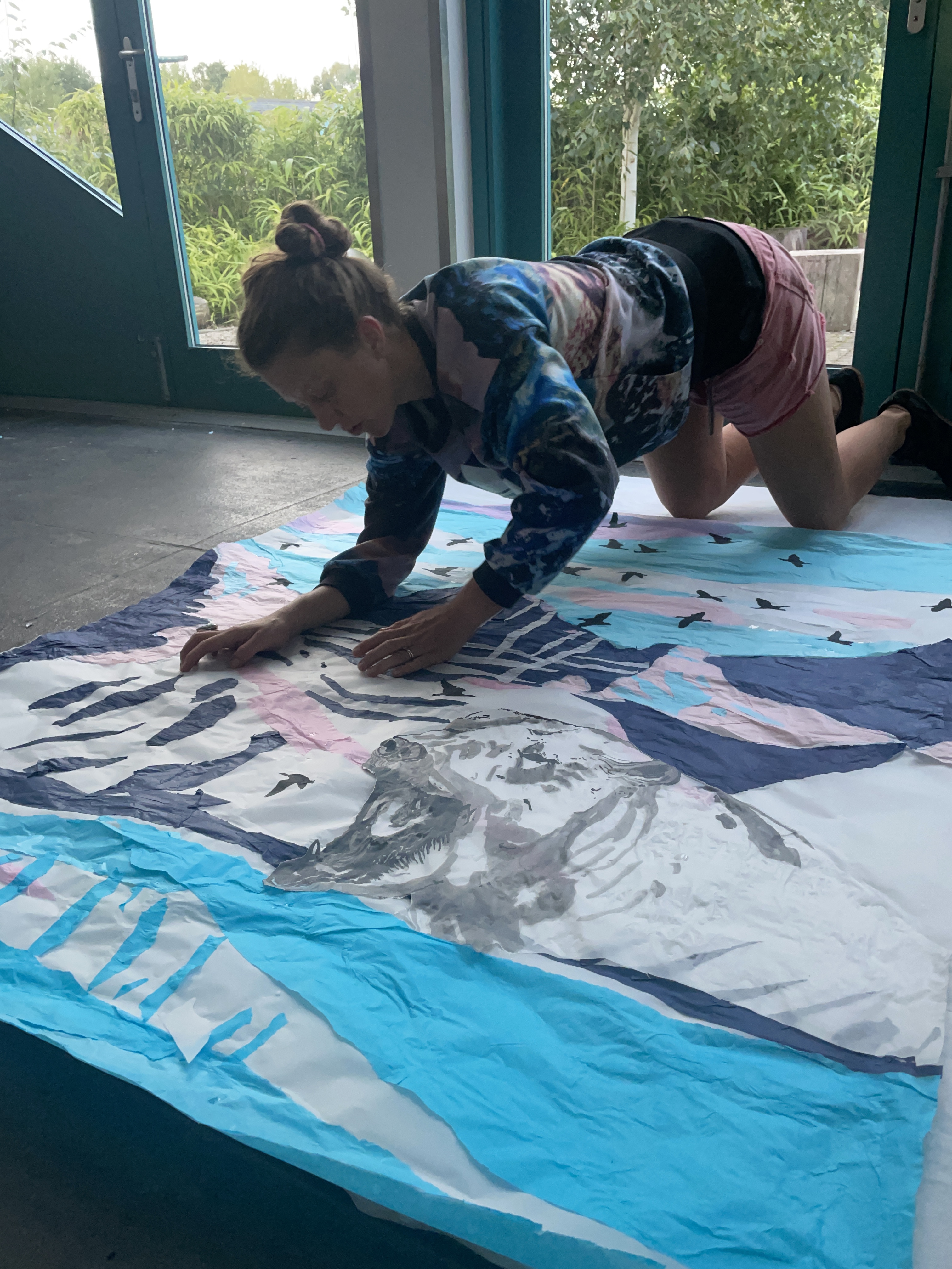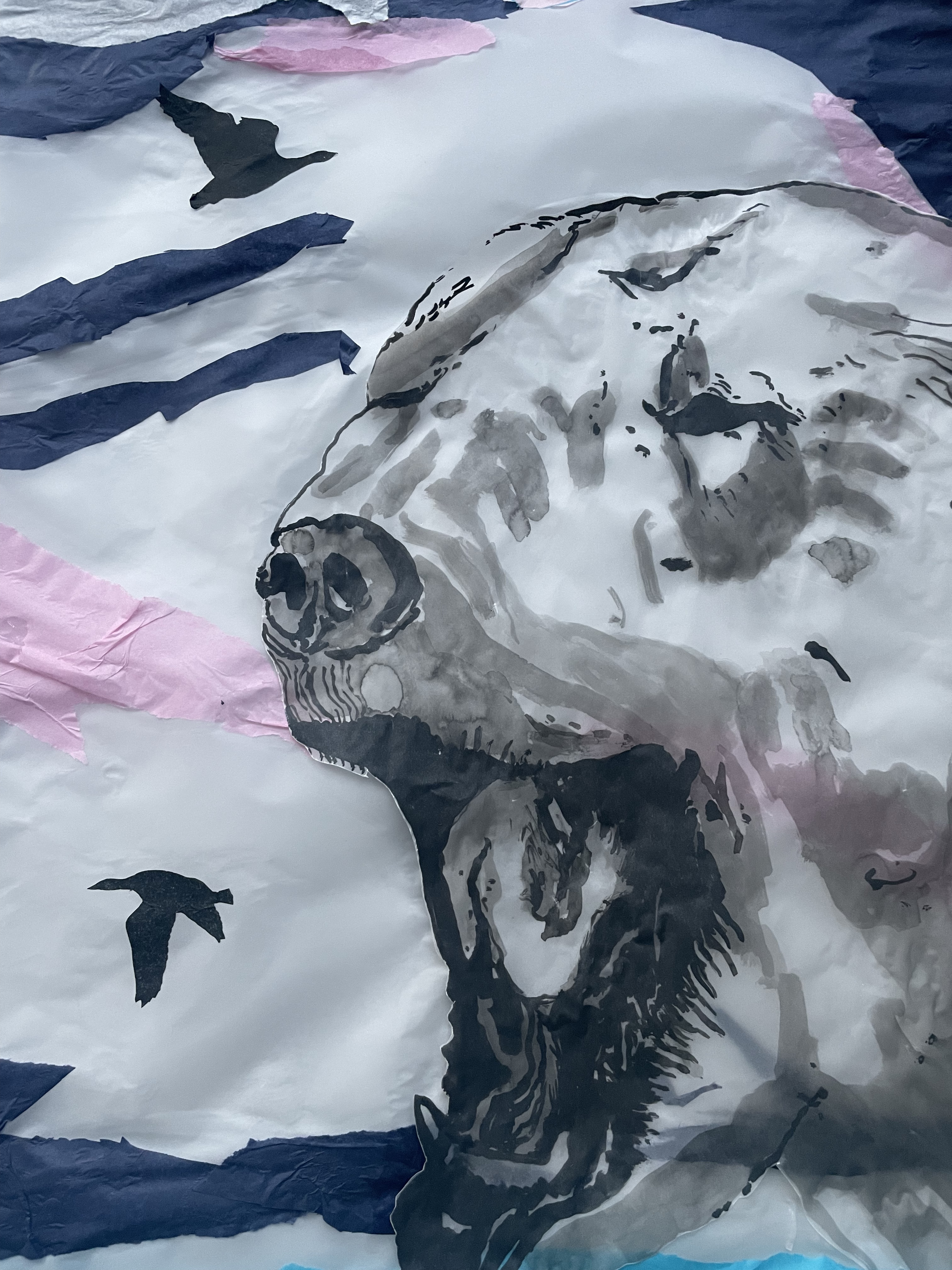 Thank you to Findhorn Bay Arts, who commissioned me to create a window design for their 2024 festival exhibition on Forres high street. The window was created by tearing an Arctic landscape out of coloured tissue paper and sticking the mountain, fjord and sky pieces to a window sized piece of tracing paper, using glue. The flock of geese was carefully cut out of black tissue paper using nail scissors and the Polar Bear was painted using black Indian Ink. The landscape is a depiction of the environment outside the Jean Corbel Research Station, near Ny Alesund, the northernmost research base on Earth and the closest settlement to the North Pole. The exhibition provided a lovely opportunity to bring a piece of Svalbard down to the town of Forres, and see that extremely northern location illuminated in the Murray Travel agents window.