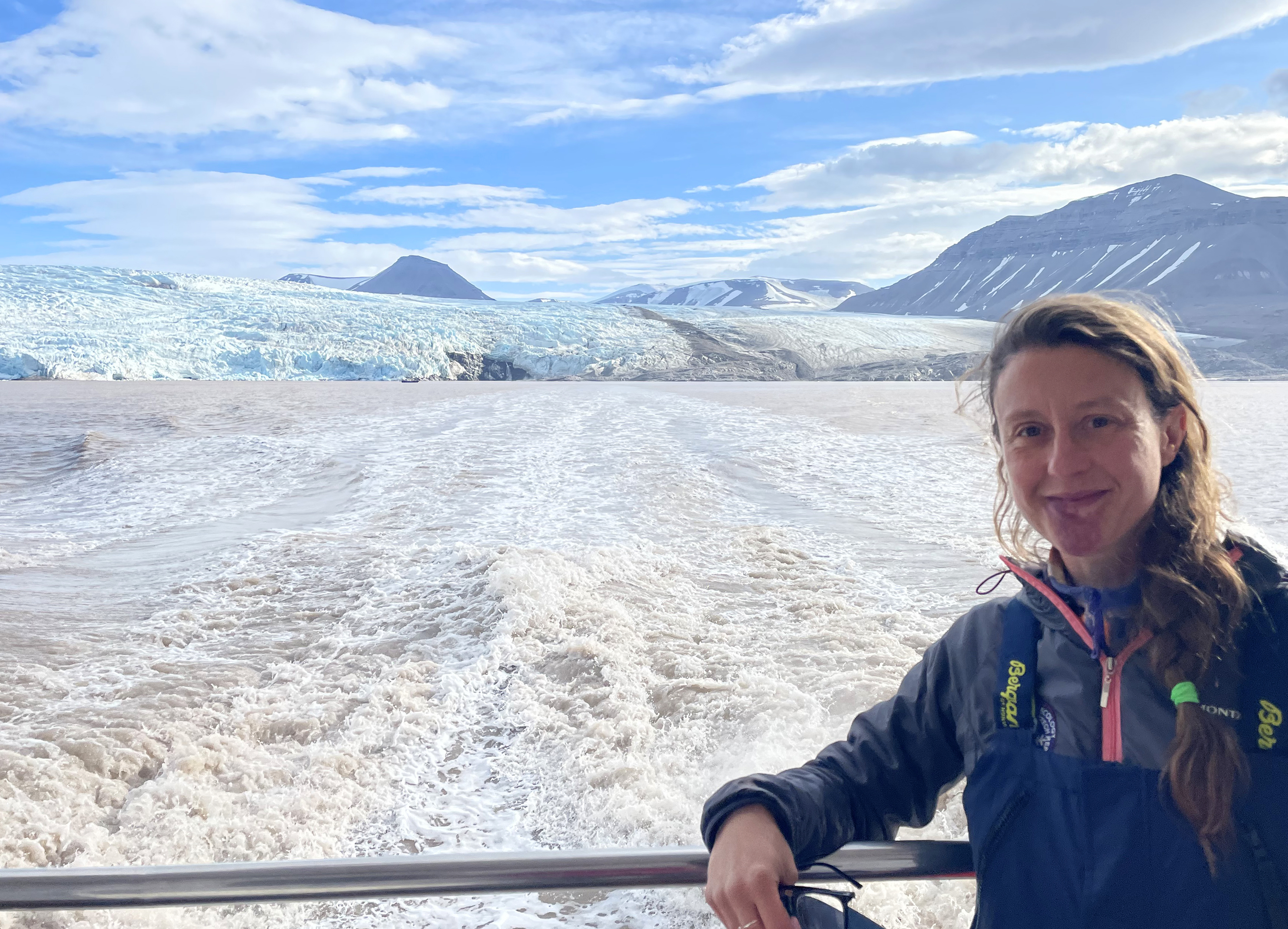 The boat then turned and headed east in to Adolfbukta, to the luminous Nordenskioldbreen- the glacier I had travelled two thousand miles to spend time painting… We spent an hour floating near the front of Nordenskioldbreen, watching waterfalls pour down her front and into the sparkling water, which had only a few tiny ice bergs floating in it. The lack of icebergs of all sizes was really shocking…The sun was dazzling and the melt was undeniable. It was incredibly humbling to be back in the presence of this most magnificent ancient being of ice, and yet it was deeply sad to see and feel how much she has changed. Historically a marine glacier but retreating fast, it now might not be long until all of the front of Nordenskioldbreen ends on black rock.