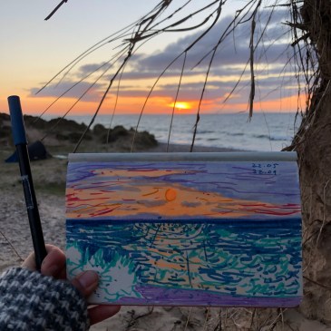 22.09 GLIMMERS OF SHIMMERING PEACH GOLD, FLOATING ON THE TIDES FRESHEST WAVES- CLOSE IN, BY THE SAND AND FAR OUT, BY THE SETTING SUN AND FILLING THE SKY, BETWIXT A PATTERNED RHTHYM OF PURPLE CLOUDS- THE PERFECT CONTRAST TO THE GLOWING EMBERS OF THE FIRE ORB WE NEED FOR LIFE AND BEHIND, ON THE OTHER … More GOLD & RAINBOW LIGHT, MOON & SHADOW GLOW. 24-HOUR SOLSTICE PAINTING. 21-22/06/21. FINDHORN